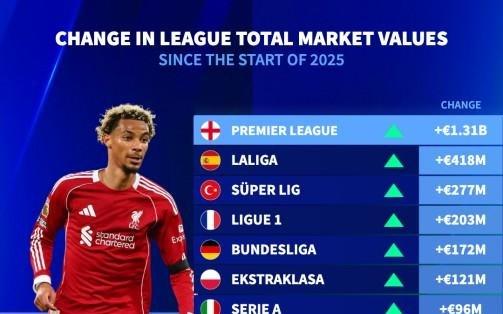 2025年欧洲15大联赛身价涨跌榜:英超增加超13亿欧元第一