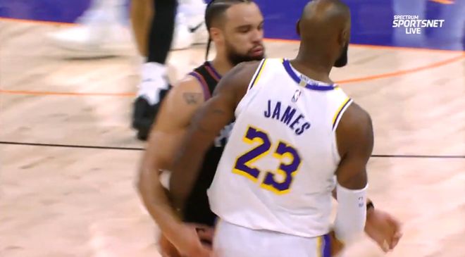 随后狄龙起身后,走向詹姆斯并撞击后者,吃到第二次技规,被裁判驱逐出场。