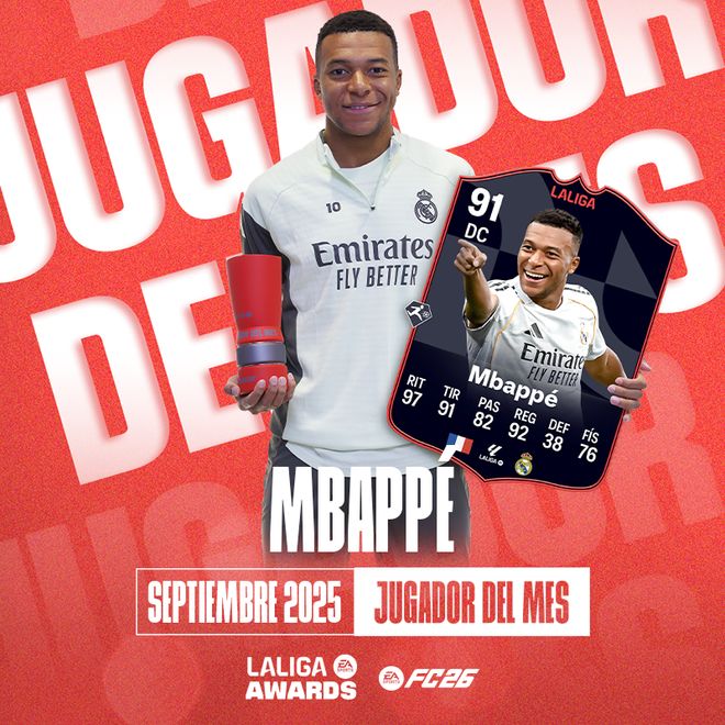 姆巴佩当选西甲联赛的9月最佳球员,该奖项由西甲联盟与EA合作颁发。这位法国前锋本月表现惊艳,已成为皇家马德里进攻端的关键人物,他帮助球队在本赛季目前进行的7场比赛中取得6场胜利。