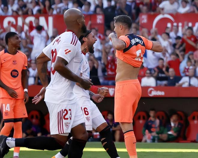 本轮之前,巴萨是唯一保持不败金身的球队,加上皇马惨败马竞,巴萨登顶第一,但是仅仅过了一轮,巴萨就从榜首的位置下滑到第二。客场对阵塞维利亚,巴萨遇到了巨大的心理压力,上半场第13分钟,阿劳霍在禁区和伊萨克-罗梅罗对抗拼抢,手上和脚下都有动作,后者倒地,裁判观看VAR之后判罚了点球,老将桑切斯一蹴而就。