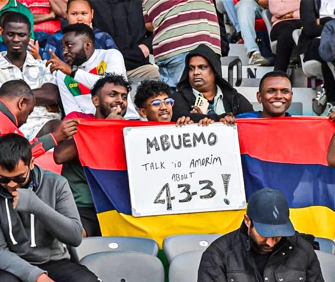 这场比赛的看台上,3名毛里求斯球迷举起毛里求斯的国旗,同时还用一个白板写道:“姆伯莫,跟阿莫林聊聊4-3-3吧!”