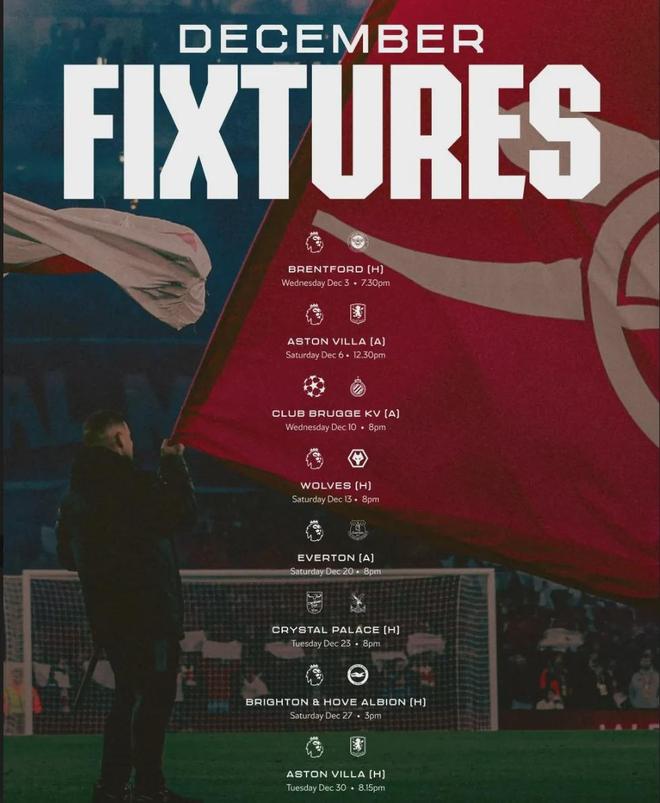 阿森纳12月赛程:主战布伦特福德、客战维拉、客战布鲁日、主战狼队、客战埃弗顿、主战水晶宫(联赛杯)、主战布莱顿、主战维拉。
